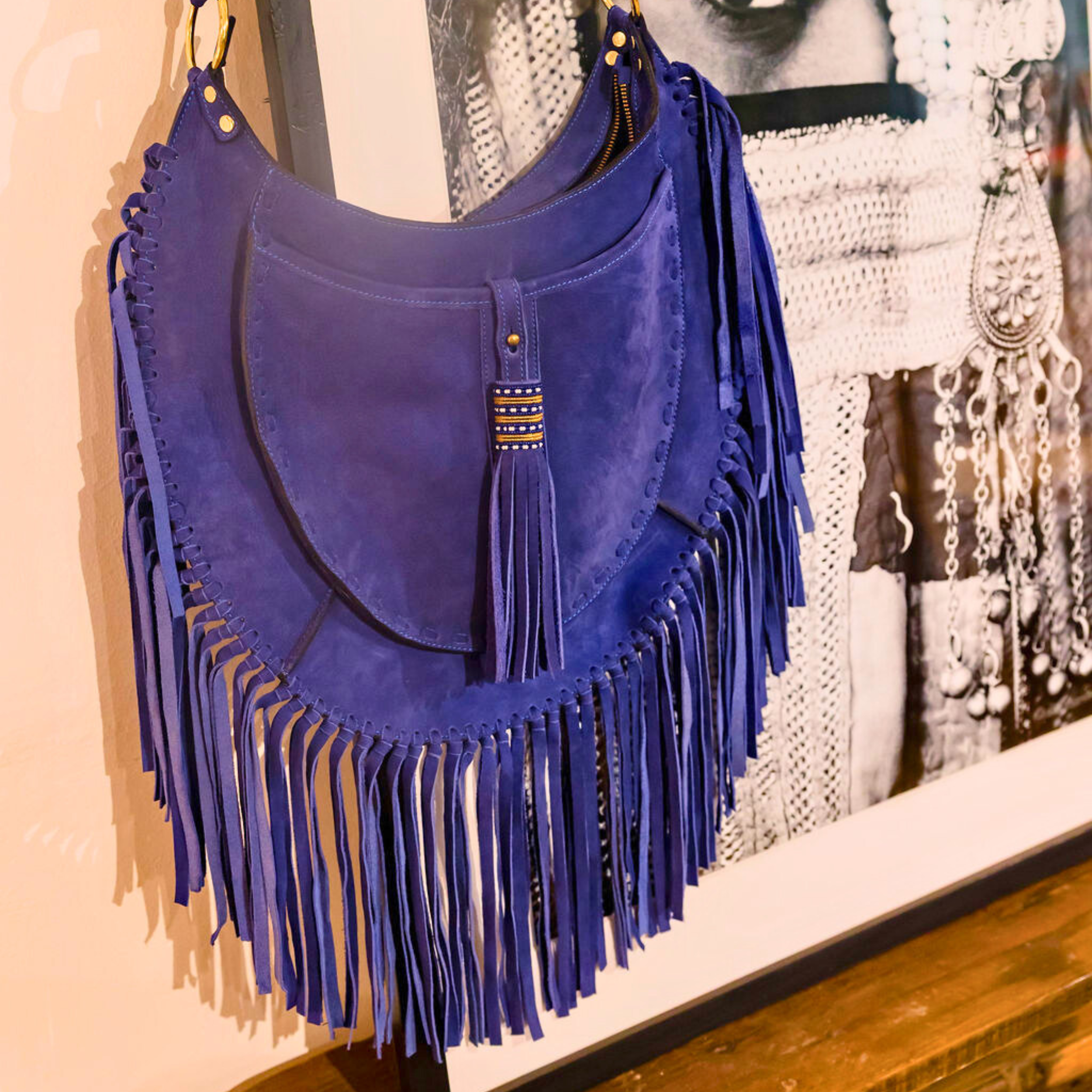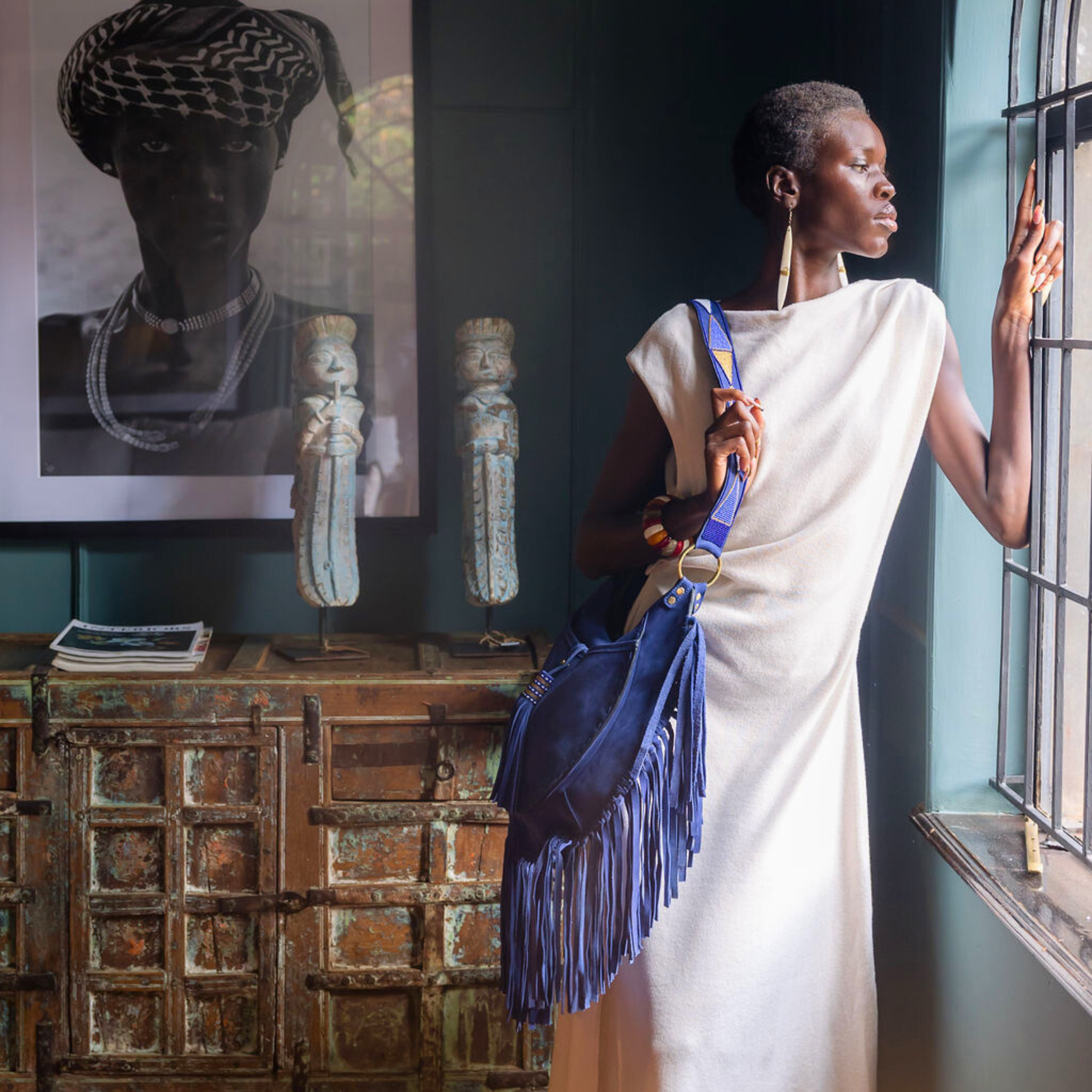 A bold expression of freedom and form. The Bastille Bag is structured yet fluid, designed to be worn crossbody or over the shoulder with its exquisitely hand-beaded strap. Cascading fringe adds movement and rhythm, echoing the energy of those who carry it. A piece that speaks of quiet rebellion and refined craftsmanship — where elegance meets edge, and every detail tells a story.